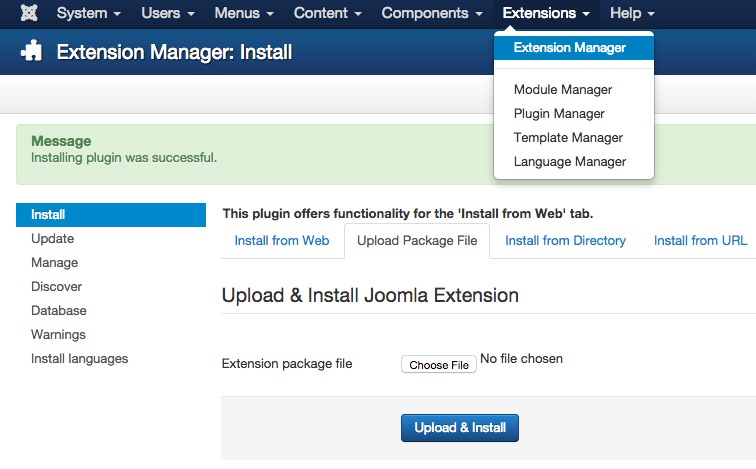Install at Extensions → Extensions Manager → Install. Select the Choose File button, locate the downloaded ZIP and click Upload & Install to begin the installation.