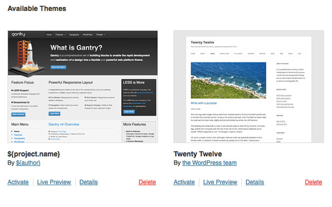 The Gantry template will appear in Themes, the Gantry plugins will appear in Plugins.