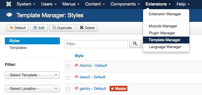 The Gantry template will appear in the Template Manager, the Gantry plugins will appear in the Plugin Manager, and RokNavMenu will be available from the Module Manager (Click New to create a new instant of RokNavMenu). The component/library will be hidden, and only accessible from the Extensions Manager for uninstallation/upgrading purposes.