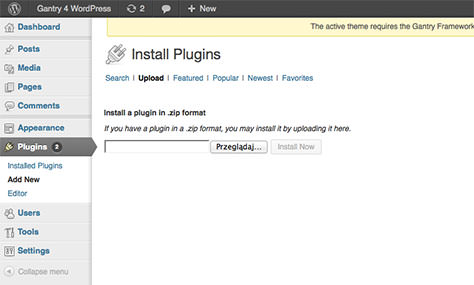To install the Gantry template, you'll need to navigate to Plugins → Add New in the admin area of WordPress. From here, select the Browse button, locate the downloaded ZIP file, and click Install Now to begin installation.