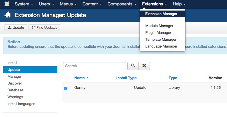 There are two methods of upgrading the Gantry Library. You can either do so via the Joomla Updater, or through an overriding reinstall. The first is the simplest and recommended method. Go to Extensions → Extensions Manager → Update, select Find Updates to load all available updates, if they are not already shown. Then, select Gantry and click Update.. Gantry will now be updated directly from the Web.