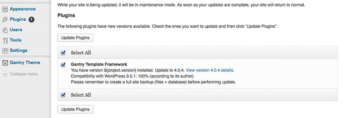 Upgrading the Gantry Framework plugin is a relatively straightforward and simple process. This can be done using the built-in WordPress updater. Go to Admin Dashboard → Updates, select Check Again to load all available updates. Then check the checkbox next to the Gantry Template Framework and click Update Plugins.. Gantry will now be updated directly from the web.
