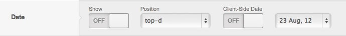 The Date feature controls the output of the current date display. From this option, you can enable/disable the display of the date, enable/disable the use of client-side date, choose from several different date format options, and select a location for the date to display using any of the available module positions in the template.