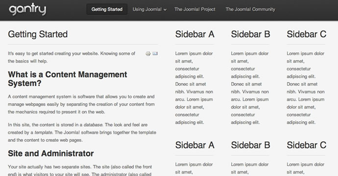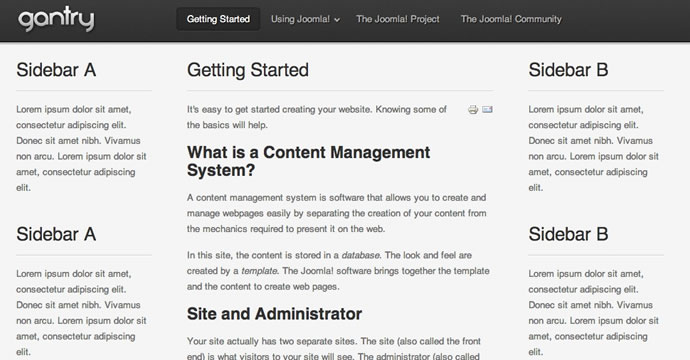 The layouts for the mainbody area is slightly different from the other module layouts. The primary difference is that the mainbody is generally displayed along with up to 3 sidebars. This provides the ability for a Gantry-powered template to effectively support a four-column layout. We researched a wide variety of sites and determined that more than four columns for a layout is very rare, and quickly becomes unreadable due to the limited amount of space available. Generally speaking, two or three columns is the preferred layout for a modern website.