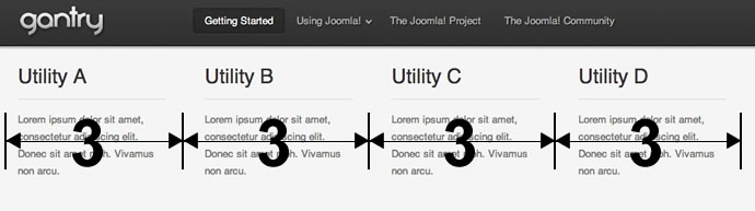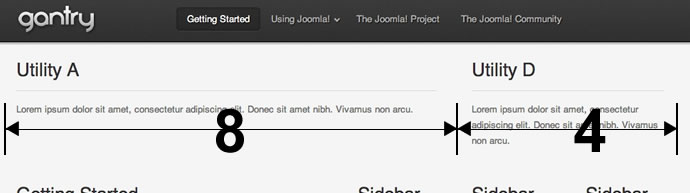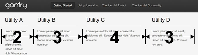In this case, you can see we have dragged the slider to the left and have chosen the layout 2 | 3 | 4 | 3, which means that module position utility-a is assigned 2 grids, utility-b is assigned 3, utility-c is assigned 4 and utility-d is assigned 3 grids. After hitting Apply or Save, this will cause the front-end's layout to change and display this: