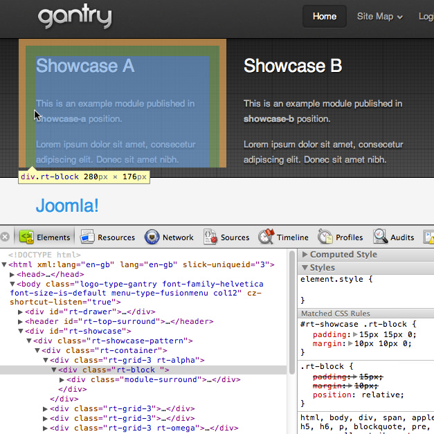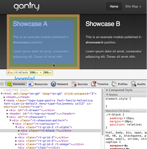 In this example, we will explain how to reduce the bottom padding and margin in the showcase position of the default gantry template which inherits rules from the rt-block element inside rt-showcase.