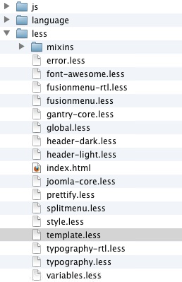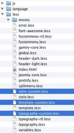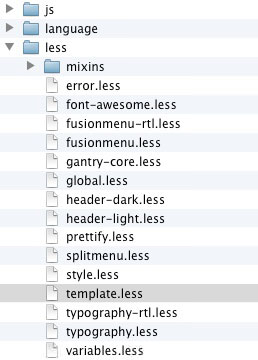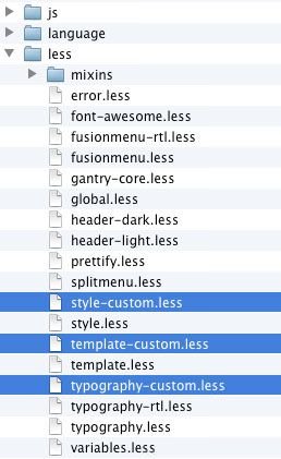 For example, in the default Gantry template, there is a file less/template.less. We can create a custom LESS file called less/template-custom.less and put our custom LESS elements in this file. Gantry will pick up the elements and compile it. You may also use other file names such as less/style-custom.less, less/typography-custom.less, and so on.