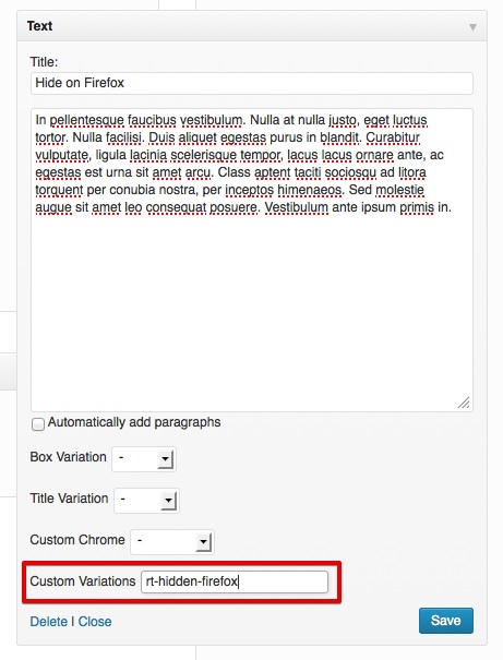 Now, we can put rt-hidden-firefox in the Custom Variations of the widget we want to hide on Firefox.