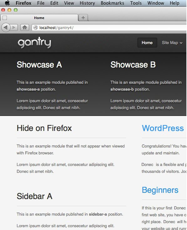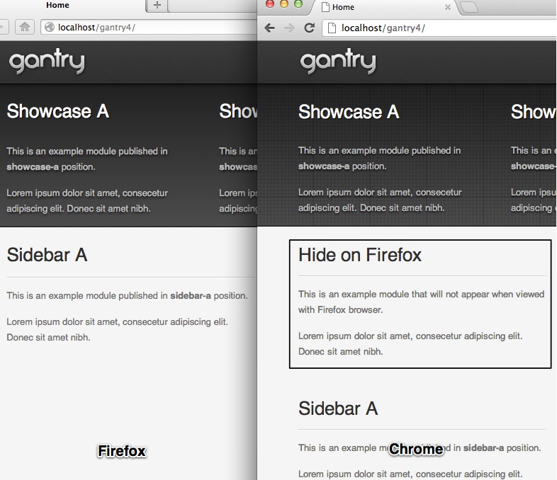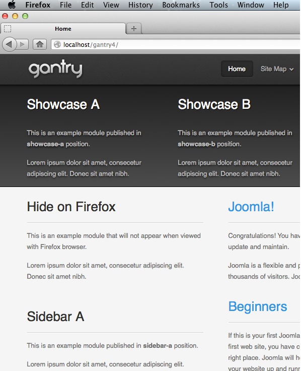 In this example, we will explain how to hide a specific module when viewed with Firefox, while keeping it visible on other browsers. In the case of the gantry default template, we need to create /templates/[TEMPLATE]/css/gantry-custom-firefox.css.