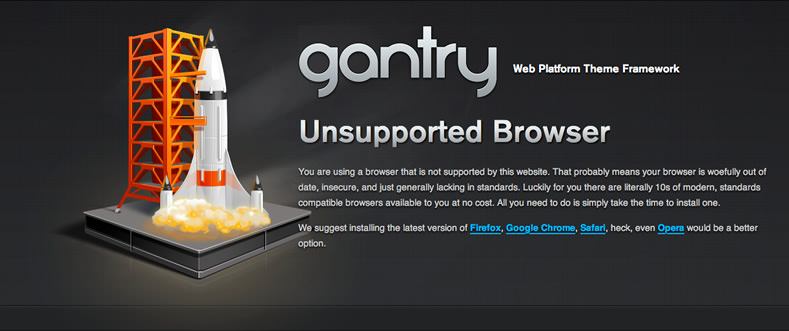 This tutorial will take you through the steps needed to create an unsupported browser page as used here on gantry-framework.org. You can see what this looks like by pointing your browser to: http://www.gantry-framework.org/?tmpl=unsupported. Users of unsupported browsers (IE6 and IE7) are automatically taken to this page whenever they try to access a page on gantry-framework.org.
