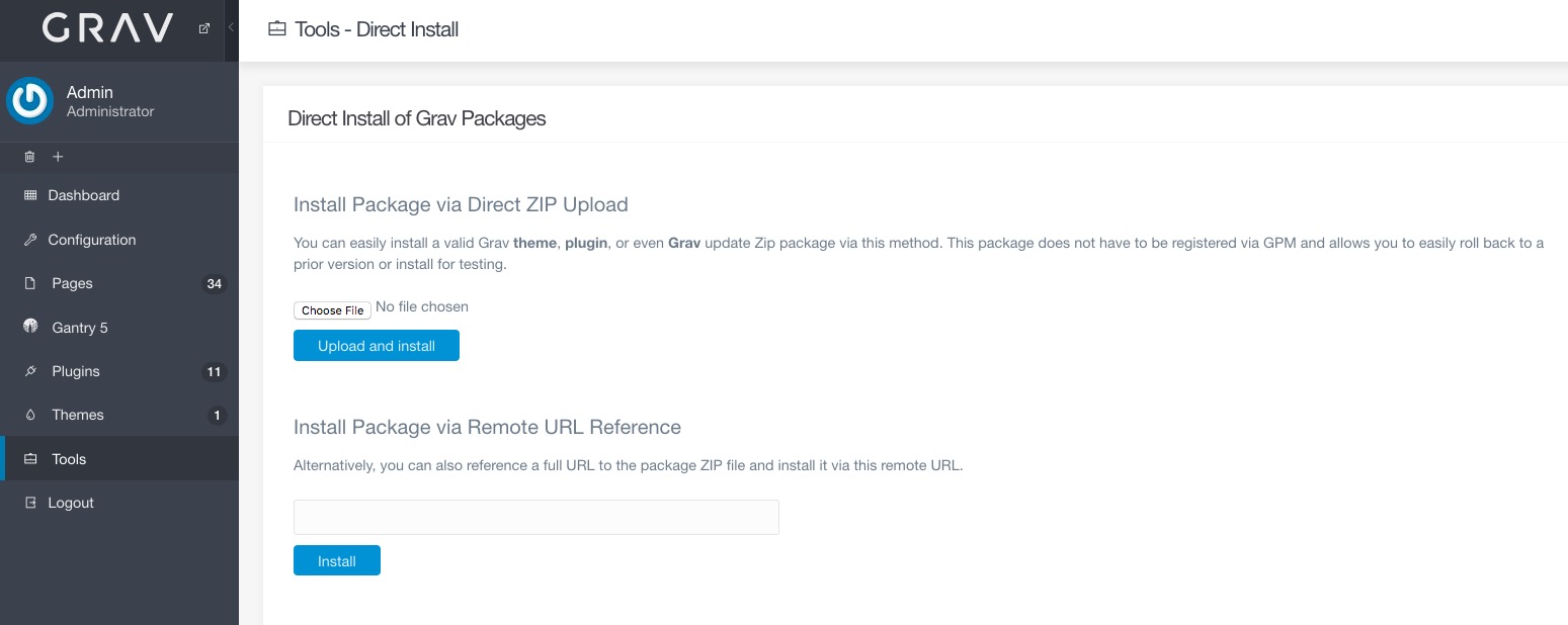 Navigate to your Grav Admin > Tools and simply install the latest theme package via the Direct ZIP Upload or Remote URL Reference options.
