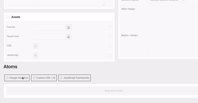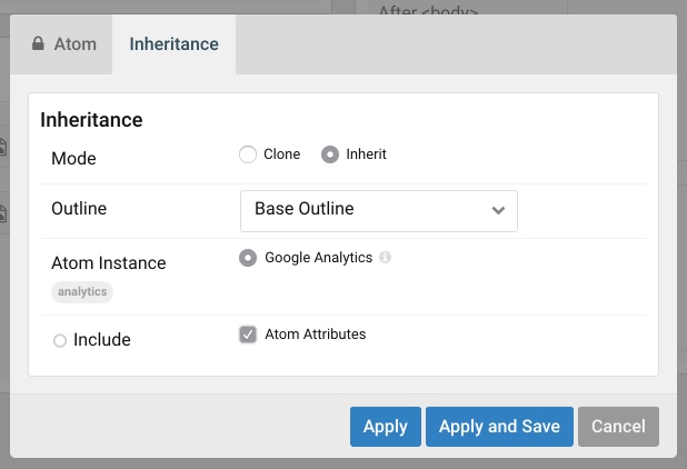 Atom inheritance works very similarly to particle inheritance. For example, if you have a Google Analytics code you want to have apply to multiple specific outlines, but not the Base Outline, you can do so easily through an atom's inheritance settings.