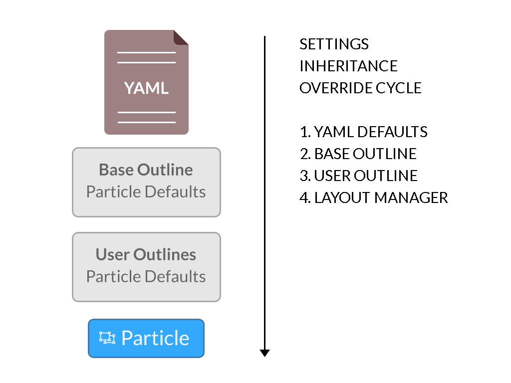 | Particle YAML File | Any defaults assigned in this file act as the absolute top-level defaults for the particle. These defaults are overridden by any changes made in the Base Outline, Sub Outlines. |