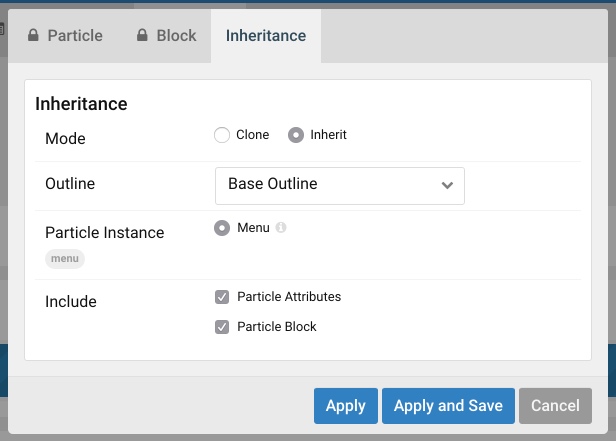 You can, if you choose, inherit or clone an entire layout from one outline to another. This is useful if you would like to inherit multiple sections and/or particles from another outline, and do not want to have to recreate all of these items individually. Doing this will create inheritance on every section and particle. You can, of course, go through and disable inheritance and/or remove individual particles manually after setting it up.