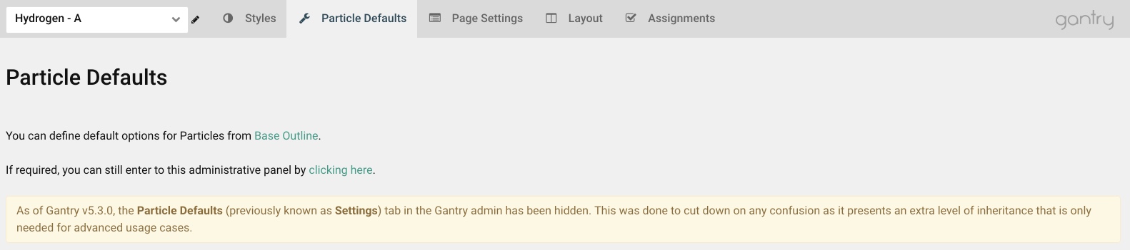 Your site's style and particle defaults settings are naturally inherited from the Base outline, and are modified from a child outline's administration panels.
