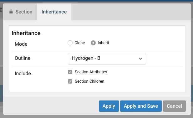 You can access a section's inheritance settings by selecting its settings icon and then the Inheritance tab. Here, you can configure how the section inherits information.