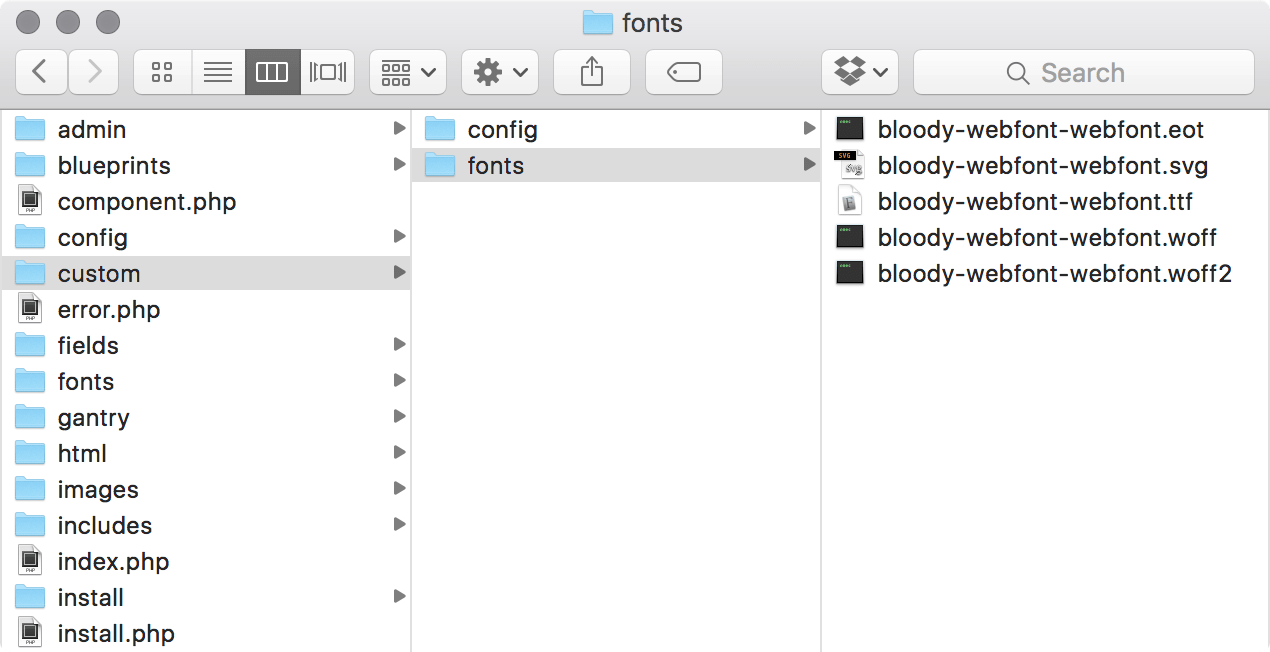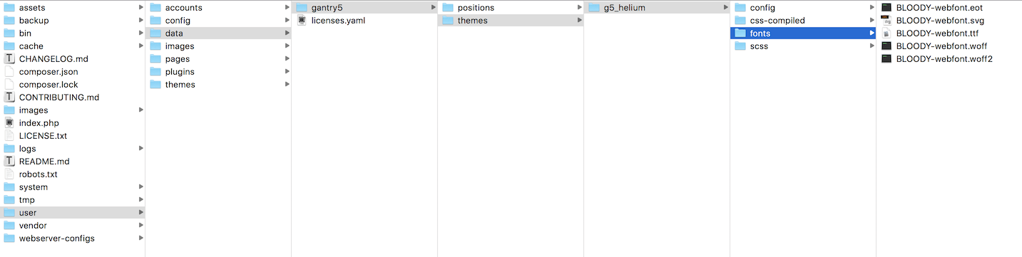 Unzip the package and move the following files to user/data/gantry5/themes/THEME_DIR/fonts/: