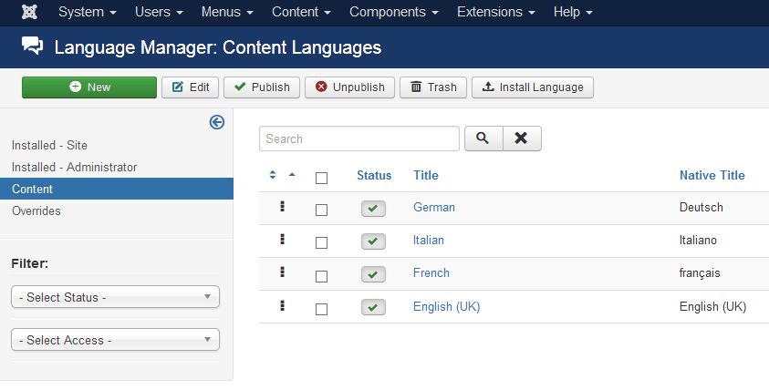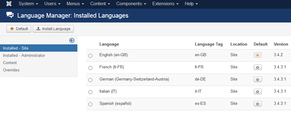 When you installed all the required languages go to Language Manager which can be reached by going to Administrator -> Extensions -> Language Manager. On the Installed - Site tab, you will see the list of all installed languages on the web site. Now, we just need to add content languages.