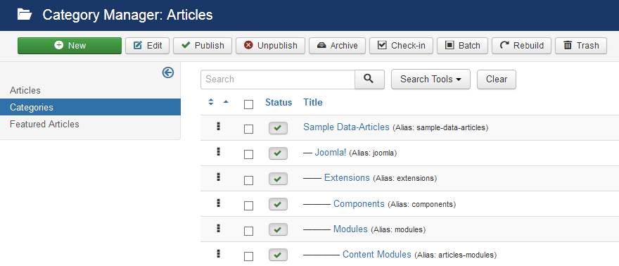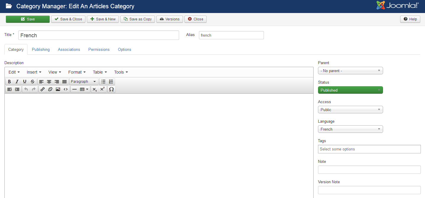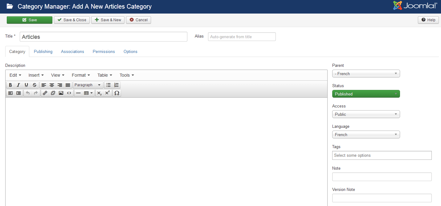 The next step is to create a new category for each language you wish to use. You can do this by navigating to Administrator -> Content -> Category Manager -> Create New Category.