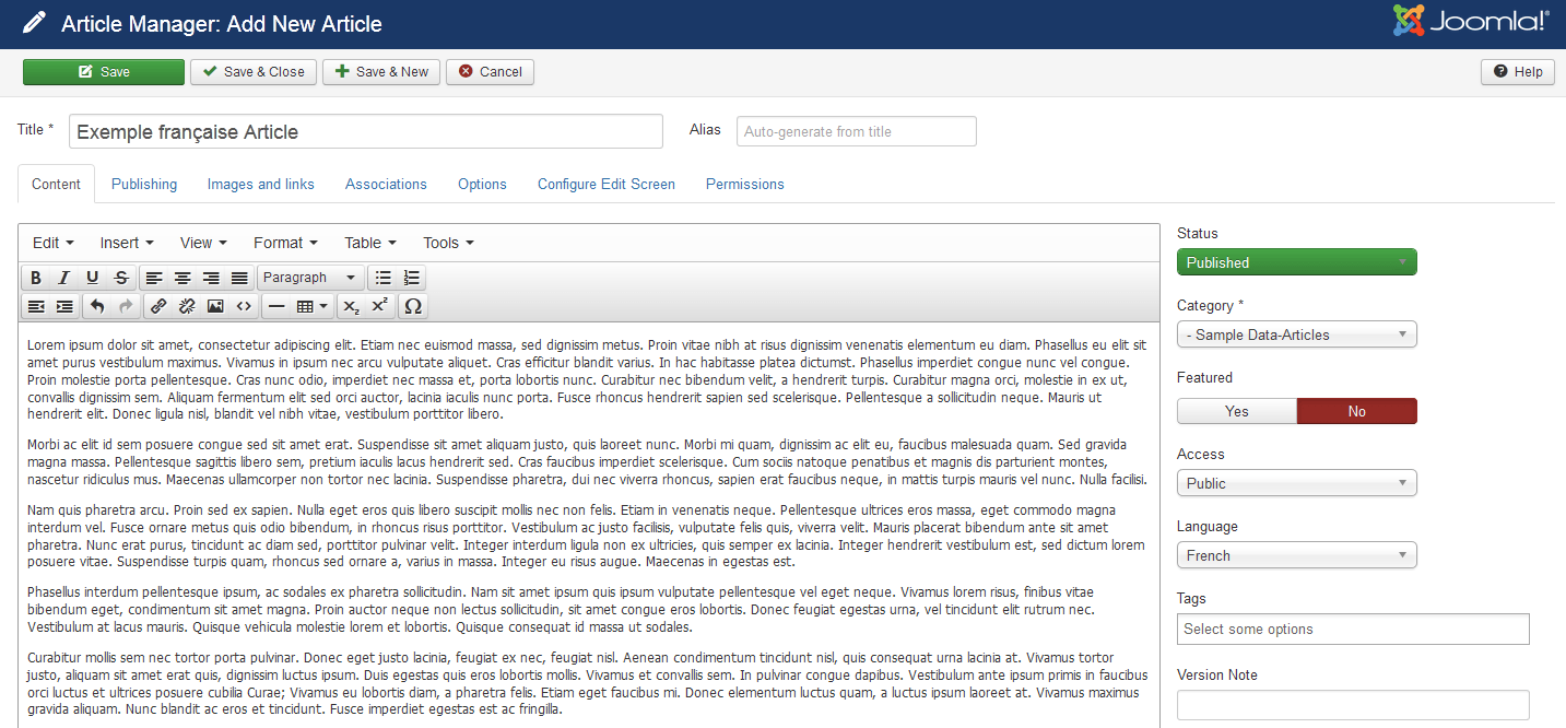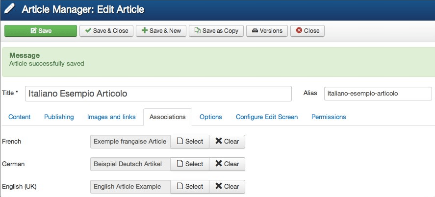 Let us say you have a copy of an article for each language. You can assign these using the Associations area of the article editor. For example, if you have a single article that would act as your language-specific home page, these should all be associated with each other here.