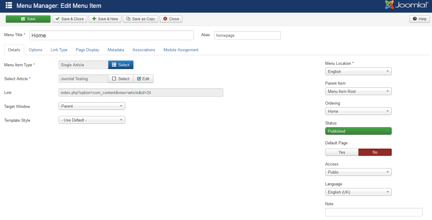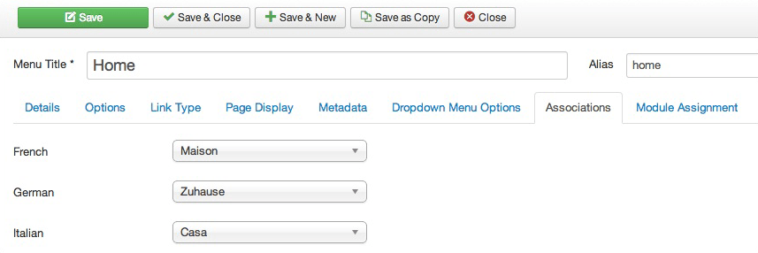 This will enable you to switch seamlessly between languages on the frontend. After building all of the default pages, simply go back and associate them with their equivalent article on opposing pages using the Associations tab. When this is done, the menu item should appear like this:
