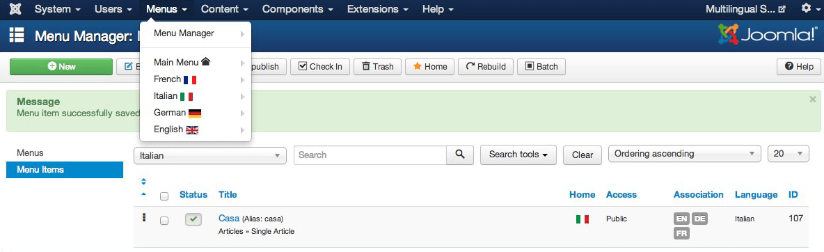 Let us say your site will use English and Italian. The frontend will have the three language buttons and we want to make sure the right menu page and article appears when the user selects a language.