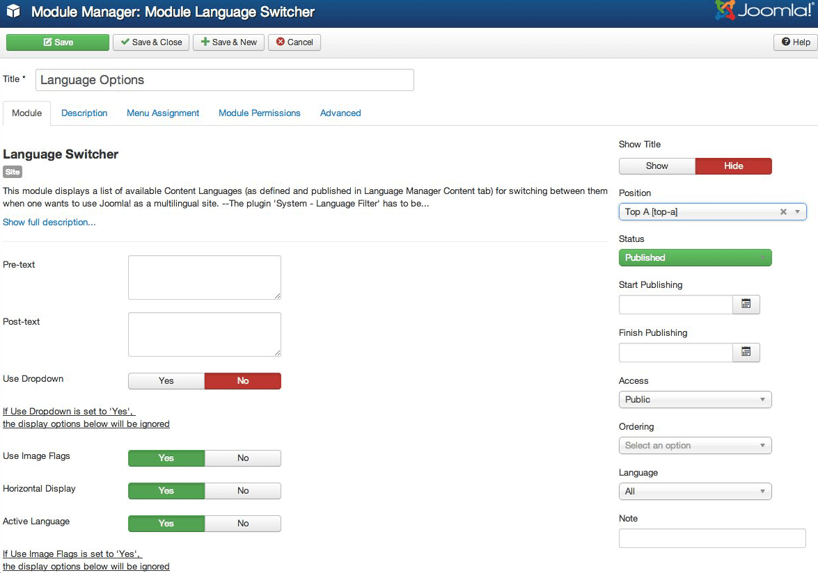 You will also want to assign the outline to the given language. This is done in the Assignments administrative panel. Simply select the language you would like to assign to the outline from the dropdown list.