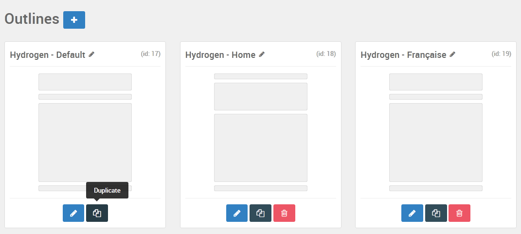 From here, you can access the Outlines administrative panel, select the outline you wish to base your new language-specific layout from, and select Duplicate. This will create a duplicate of the outline, which you can modify to include the language-specific menu and set assign a language to the override.