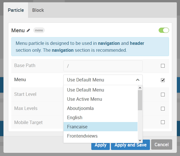 Next, you will want to change the main menu to the one you created for the language. For example, if this template style is assigned to Française, then you will want to select the Française (French) menu.