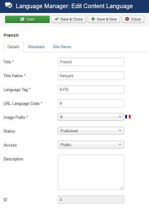 Once you have filled in this information, click Save and Close. This will take you back to the Content Languages page where you will see your new language(s) listed along with any pre-existing content languages.