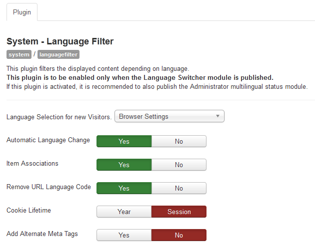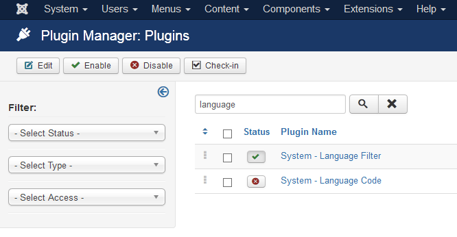 The next step requires you to navigate to Extensions -> Plug-in Manager in order to configure Joomla multilingual plugin. The plugin you need to find here is System - Language Filter. This plugin enables the CMS to recognize various installed languages and filter content so what is displayed matches the language selected.