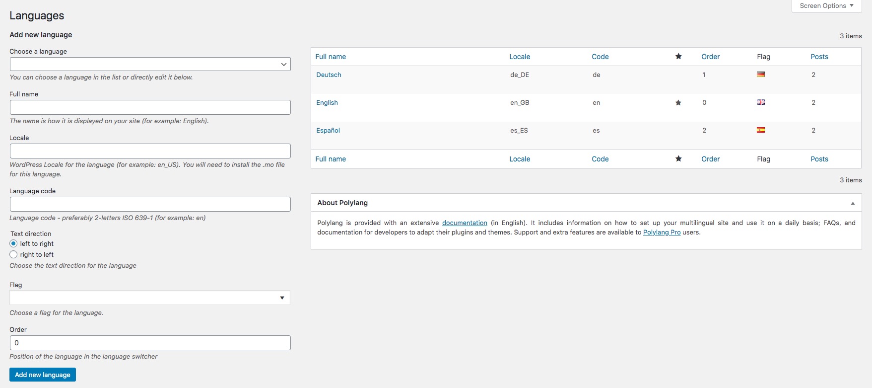 First thing that you should do is to install additional languages that will be used on the web site via Polylang settings.