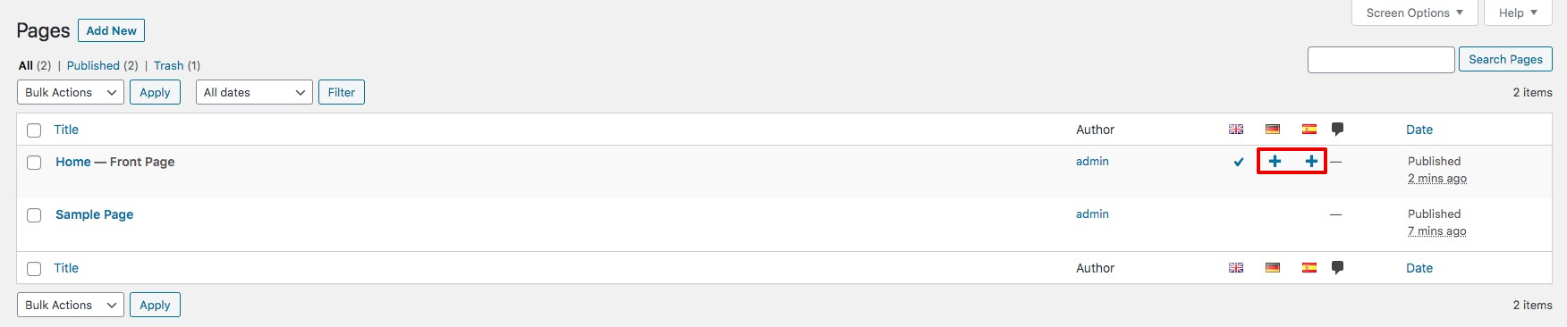In your WordPress admin, select Pages. Select the plus icons next to your Home page (and subpages) and begin setting up each page in the languages you have set up.