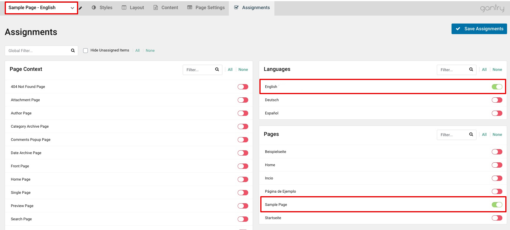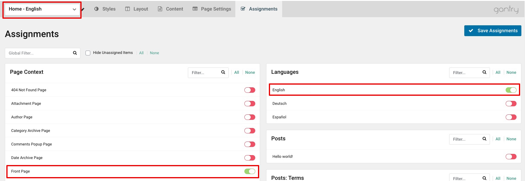 Now select the Assignments tab on one of your Home outlines. Simply assign it to the Front Page and associated Language (if you do not have a specific page as Front Page/Home Page, simply assign it to your desired page).