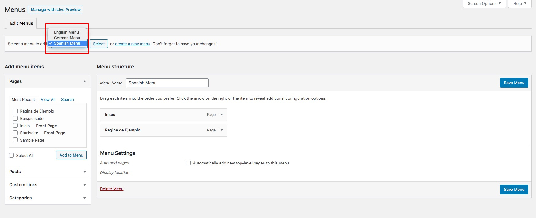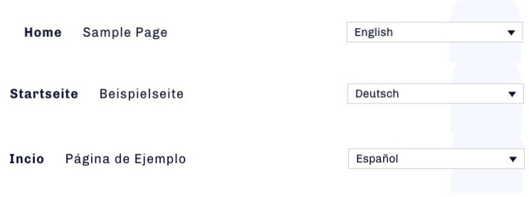 Visit the frontend of your site and you should now see the language switcher and the associated Menu when selecting each language.
