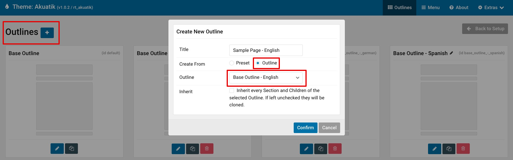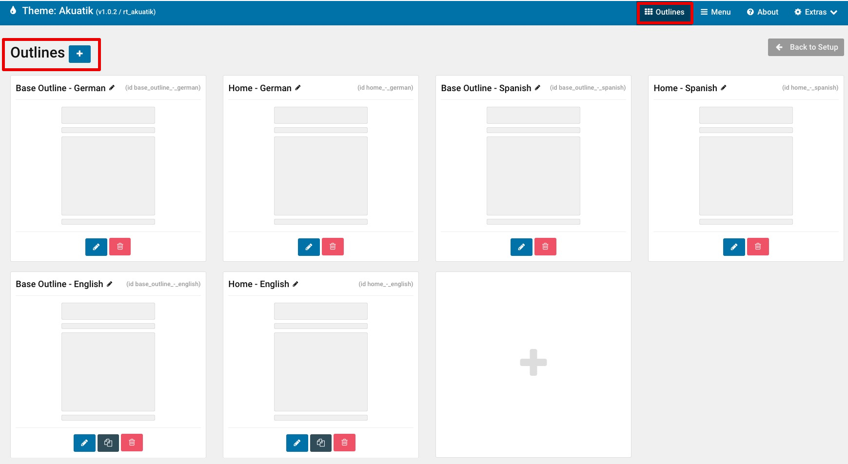 Click on Outlines in your theme settings to begin creating new Subpage outlines. You can clone them from any of your Base or Home outlines.