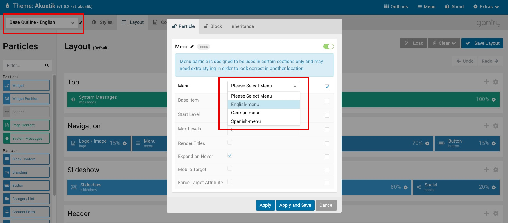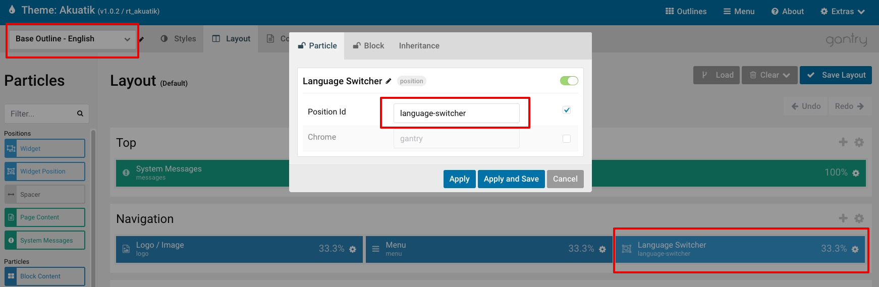 Next visit your Gantry theme settings -> Outlines. Begin creating Base Outlines (which will serve as the default layout) and Home outlines for each language.