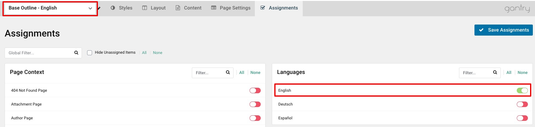 Go back to your theme settings, and select one of your Base Outlines and click on the Assignments tab. Simply assign it to the Language associated with this outline. Repeat this step for each of your Base Outlines.