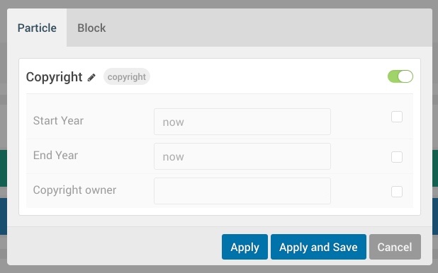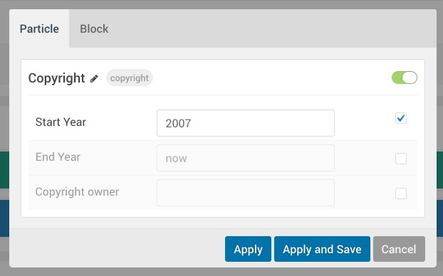 In the image above, you will see the Copyright Particle on the left-hand side. There are no links or anything included in the core Particle. If you wanted to have the name of the copyright-holder become a link to that copyright holder's website, you can add a few simple changes to the Particle's source files.